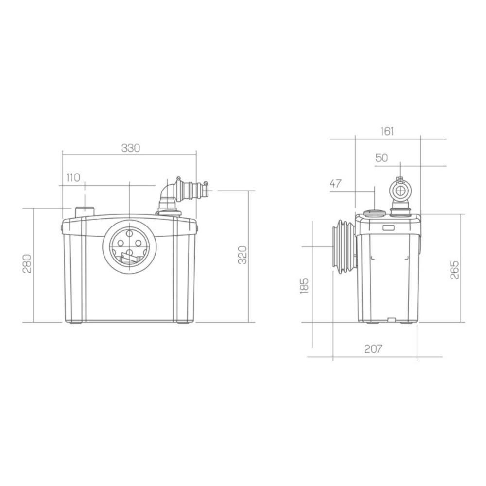 O equipamento evacua as águas residuais de uma sanita com saída horizontal e um lavatório, tritura as matérias e permite por isso uma evacuação com tubagem de 32 mm de diâmetro. A instalação é fácil: